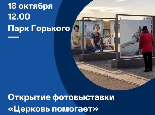 18 октября в 12:00 в Парке Горького состоится открытие фотовыставки «Церковь помогает». Церемонию открытия возглавит председатель Синодального отдела по благотворительности, руководитель Патриаршей гуманитарной миссии протоиерей Михаил Потокин. Тема фотовыставки – помощь церковных добровольцев пострадавшим мирным жителям в зоне конфликта. На фотографиях представлена деятельность добровольцев-ремонтников, сестер милосердия, добровольцев по уходу, а также социальных волонтеров в церковных центрах помощи в Донецке, Мариуполе, Волновахе, Авдеевке.